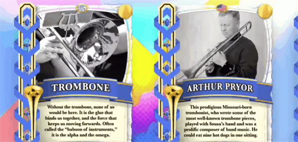 长号冠军是一款非常有趣的音乐节奏游戏平台,它主要能够帮助玩家轻松演奏各种曲目,且只需要前后移动鼠标就可以调整音高,并点击鼠标吹响长号,让你的音乐演奏更加简便。当然,这款长号冠军游戏还包含超过60首风格多样的曲目,涵盖国歌、古典乐、电子乐等,每首曲目都有独特动画背景。此外,在游戏中玩家还可以收集50张长号手卡牌,解锁不同长号外观和角色哦,让你在自由模式中即兴演奏,体验真实的音乐节奏乐趣。