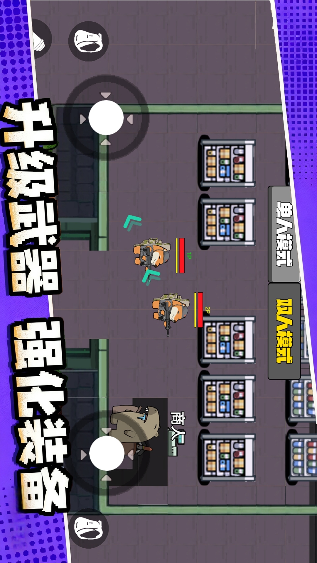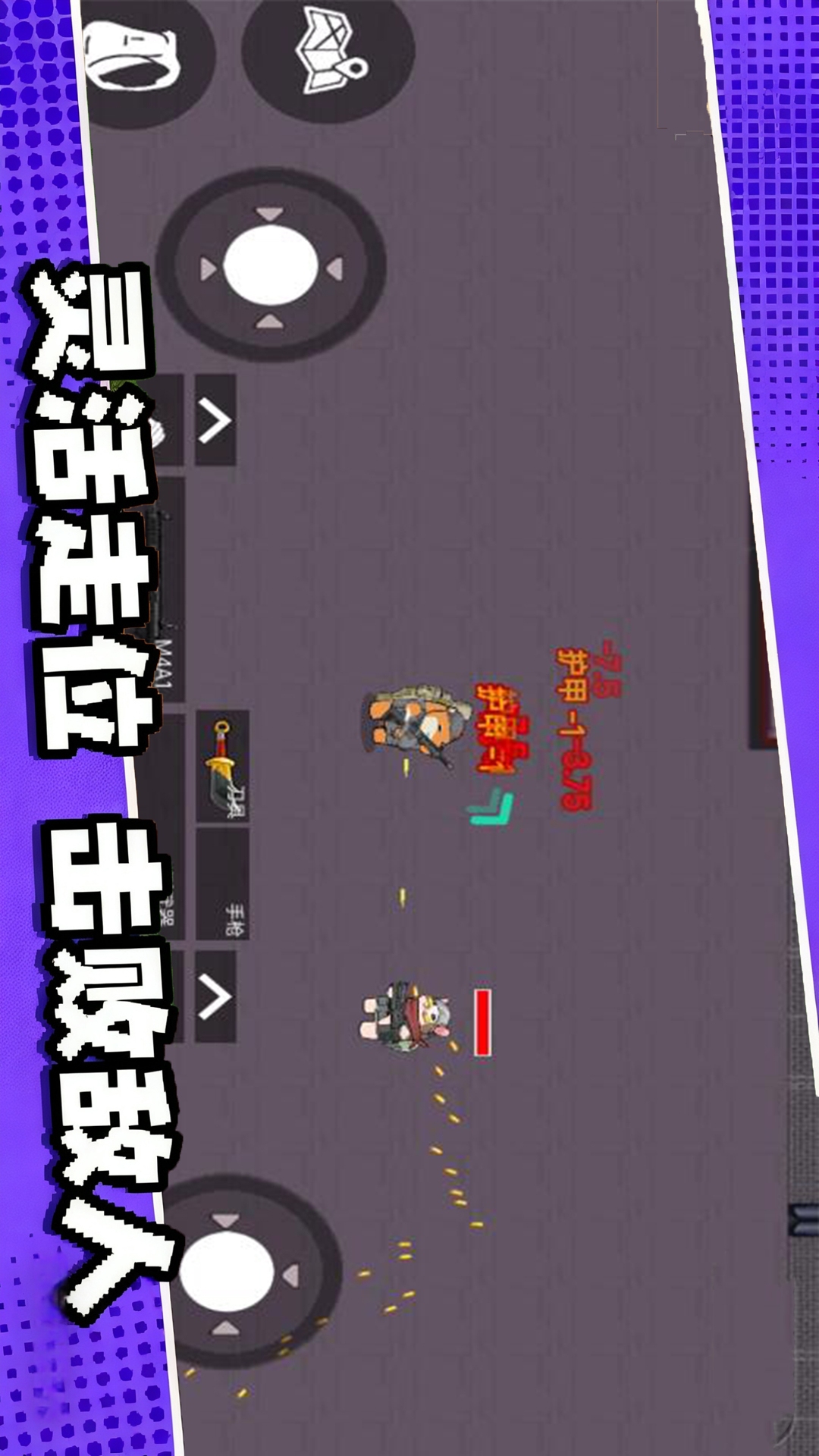1、控制角色在横版场景中移动和射击,比如用虚拟按键瞄准和开火。你需要灵活走位,避免被敌人击中。