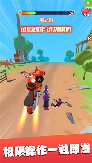 1、进入赛道后,操控机甲摩托手控制行驶方向与速度,在保持自身稳定的同时,利用碰撞技巧干扰对手行驶,争夺领先位置。