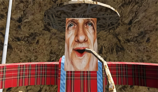 2、如果你靠近约翰,他就会突然跳到你脸上并将你绑架到一个神秘空间,不断唱着“挖掘机里腌萝卜咿呀咿呀哟”
