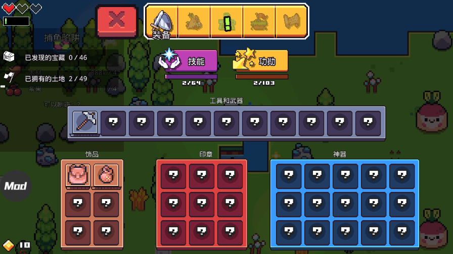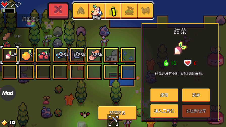 3、工具与伙伴:斧镐钓竿齐全,外出采集偶遇小动物,自动补充体力。