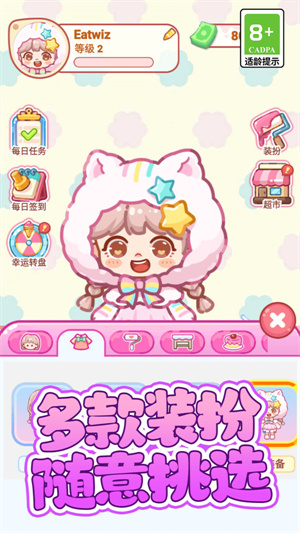 1、你可以选择不同风格的可爱少女角色,并为她搭配服装、发型与配饰,打造心目中的理想形象。
