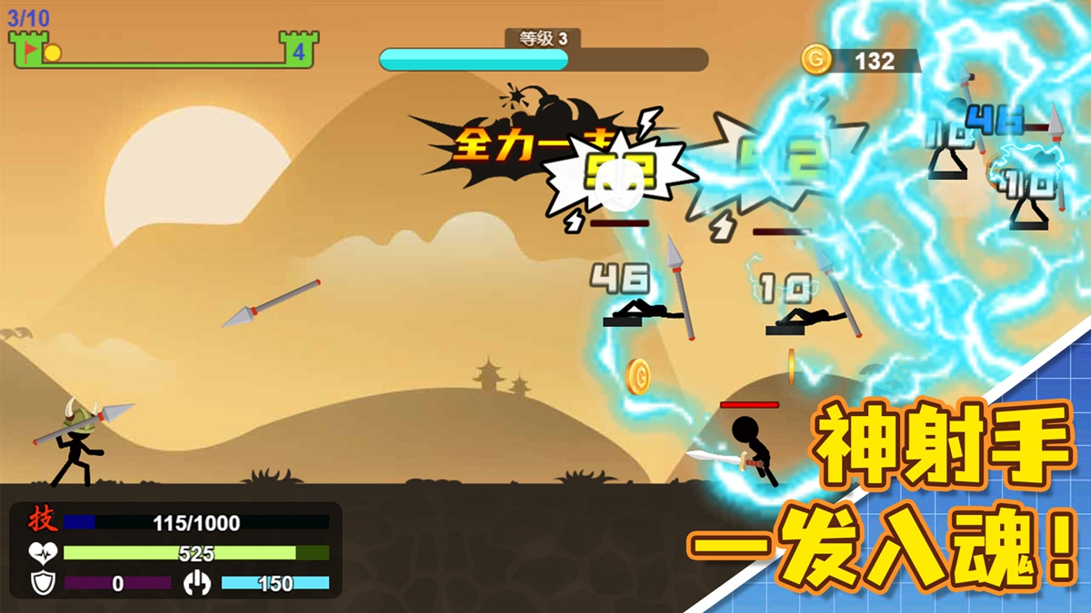 2、按住屏幕调整投掷角度,滑动控制力度,松手后火柴人将掷出利剑攻击目标。