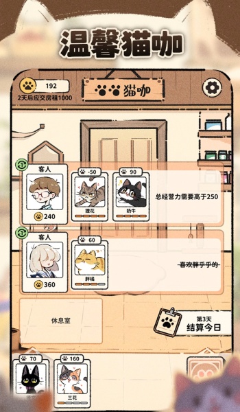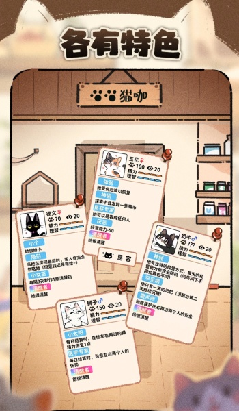 3、猫咪不仅是猫咖的灵魂,也是解谜的重要一环。游戏中有多种不同花色和性格的猫咪,每只猫都有独特的喜好。