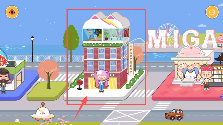 2、点左上角摄像头图标,进入MIGA城镇场景,逛逛公寓楼和旁边商店。