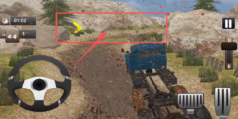4、盯左上角时间,看前方黄标检查点,换D挡踩油门,越野土路冲向山地目标。