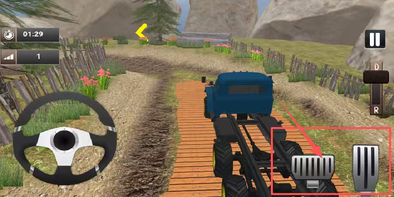 3、看左上角计时器,握方向盘,踩油门刹车,用DR键控制卡车过木板桥。