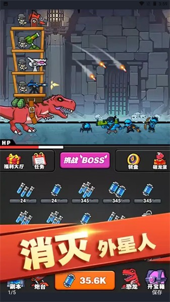 一款自由组装的横版射击闯关游戏,能够将各种装备装置在恐龙身上,背上大炮来前进突破,不畏惧任何的敌人,用精确的打击来消灭所有的外星机甲敌人吧。是一款非常有趣的策略塔防类手游,该游戏主要就是以恐龙为主,并整个游戏的画风以清新可爱的卡通风为主,为玩家带来真实的打击爽快感。