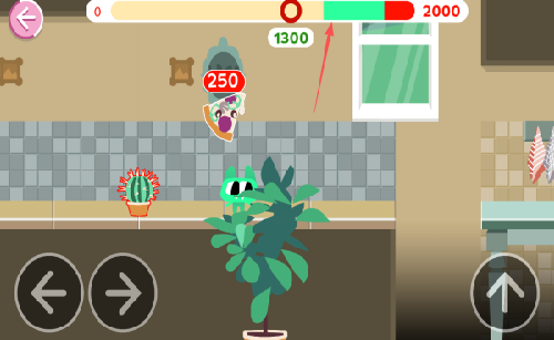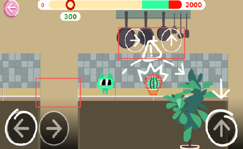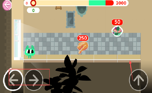 1、点击左侧下方的左右按钮,控制着我们的猫进行移动,右侧是跳跃的按钮。