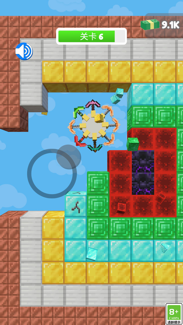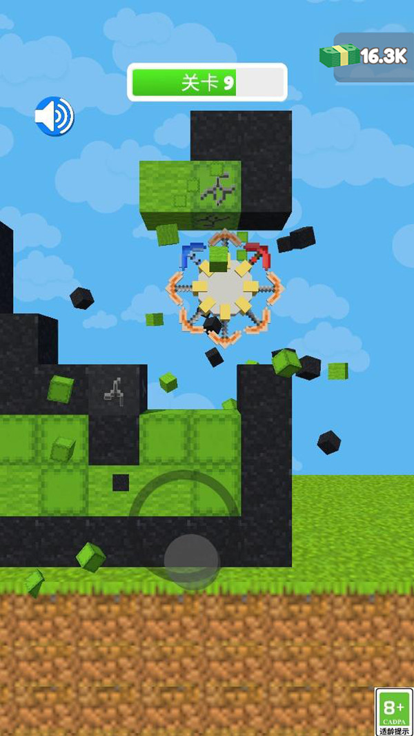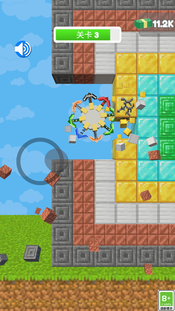 2、玩家通过合并相同等级的十字镐解锁更高级工具,再释放镐子击碎方块获取资源;