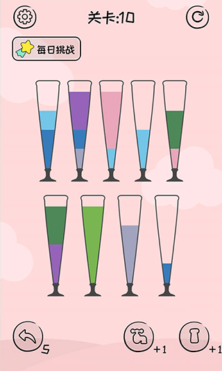 是一款非常有趣的休闲益智类游戏,玩家需要对每个杯子的颜色进行排序分类,将颜色相同的倒入同一个杯子里,每个杯子里面的颜色都是不一样的,有的甚至有多种颜色相互分层,需要我们开动小智慧,将每一种颜色分离开,然后将全部相同的颜色进行倒入同一个杯子中就能顺利通关了,通关的难度先易后难,每过一关都会有新的挑战,更是有限时赛,等你来挑战,在规定的时间内快速通关,非常考验玩家的判断力和思维敏捷能力!