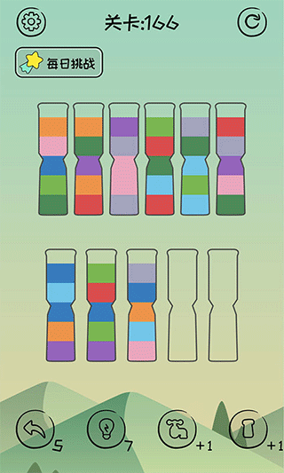 1、轻击水瓶即可开始游戏,只有相同颜色且有足够空间才能开始倒沙