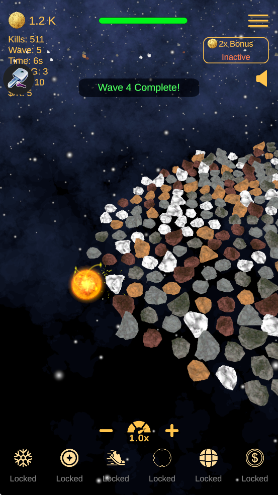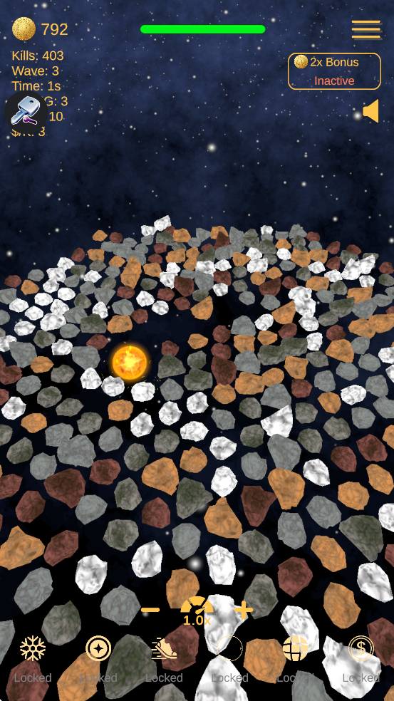 1、玩家通过触摸或按键控制星球移动,避开障碍物,专门瞄准碎石块吸收。