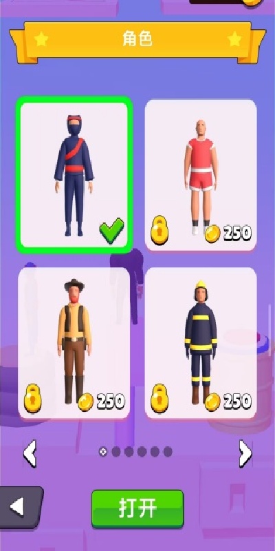 1、登录进入游戏,首先选择自己的角色,或者使用金币购买更多角色,体验不一样的游戏视觉效果。