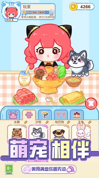 3、接受萌宠顾客的订单,完成任务后获得奖励,用来解锁新道具和升级厨房设备。