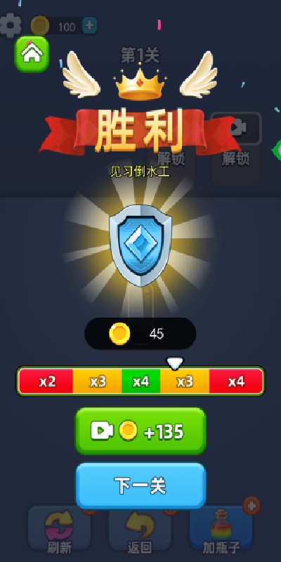 3、当你将所有同色的水都倒入了杯子里只有,就算是成功的闯关,可以获得金币。