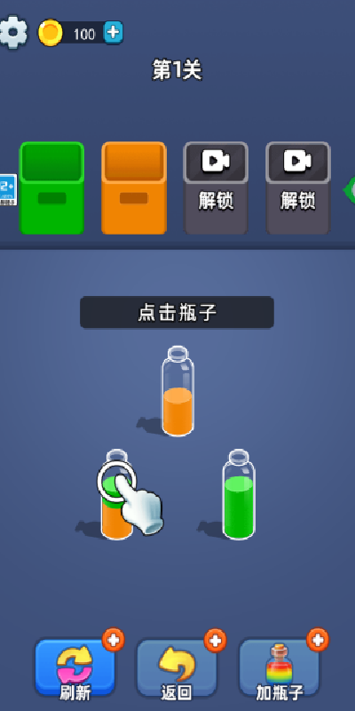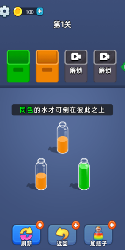 2、同色的水才可以倒在彼此之上,你要仔细观察,然后再去完成倒水操作。