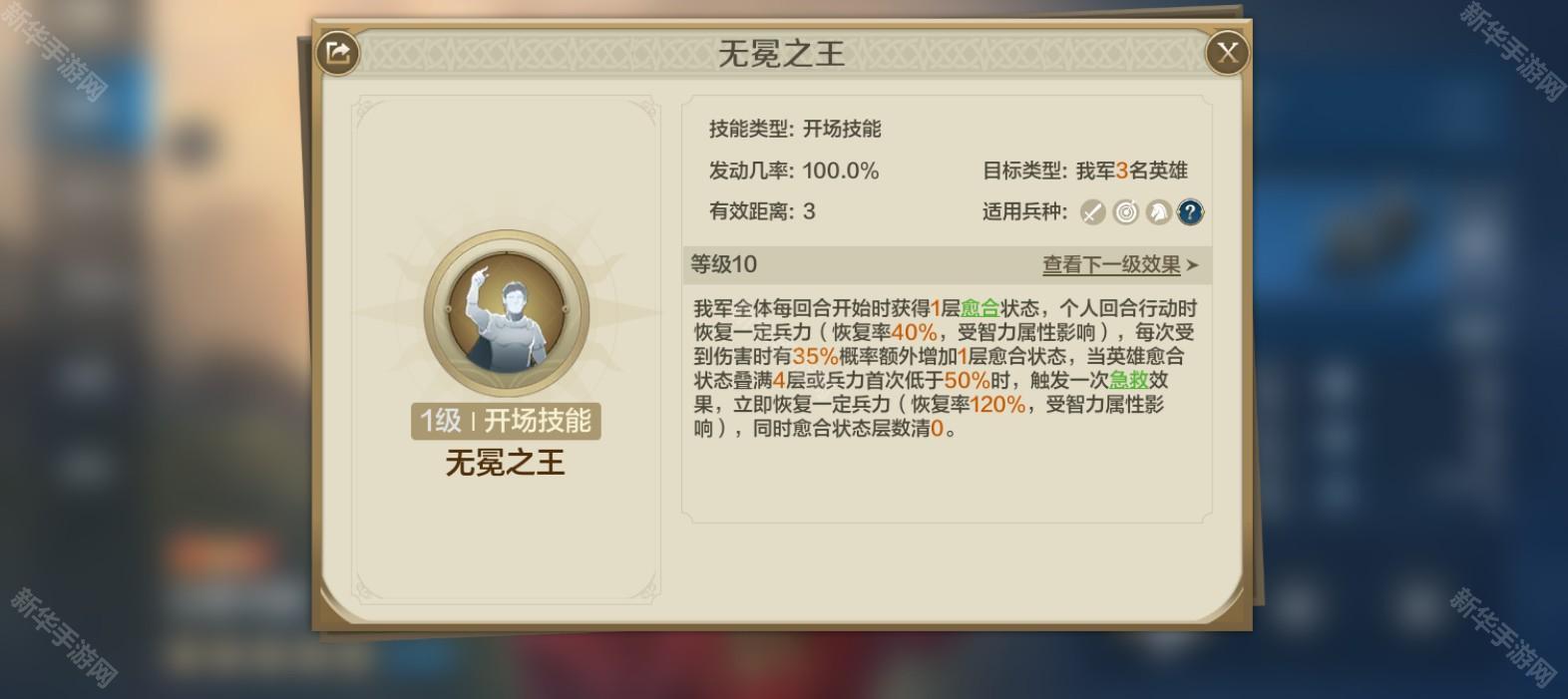 每回合开始时获得愈合状态,行动时恢复兵力,受伤时可能增加愈合层数