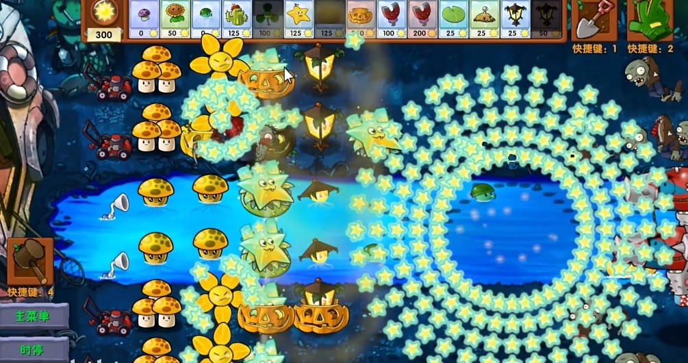 每隔一段时间可以生成一个大星星,向僵尸方向落下,变成几十颗星星攻击。